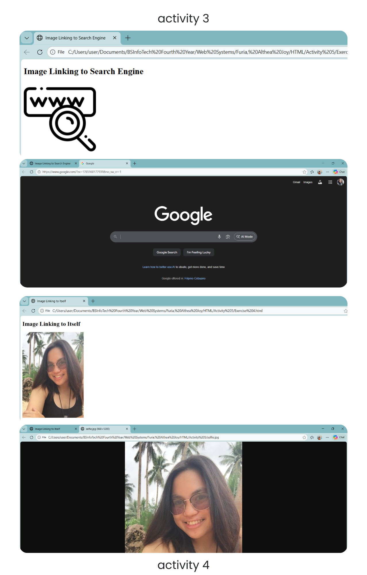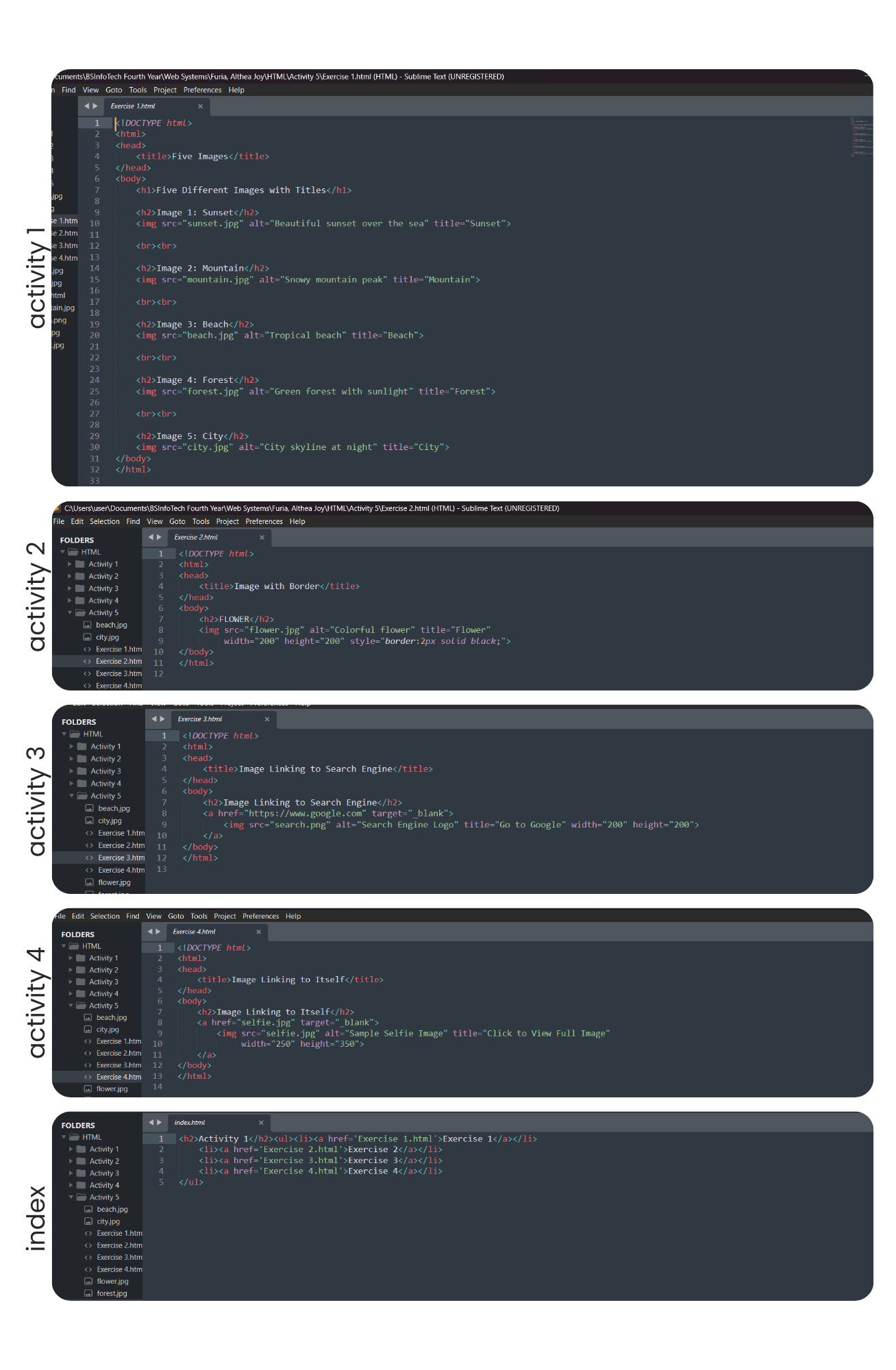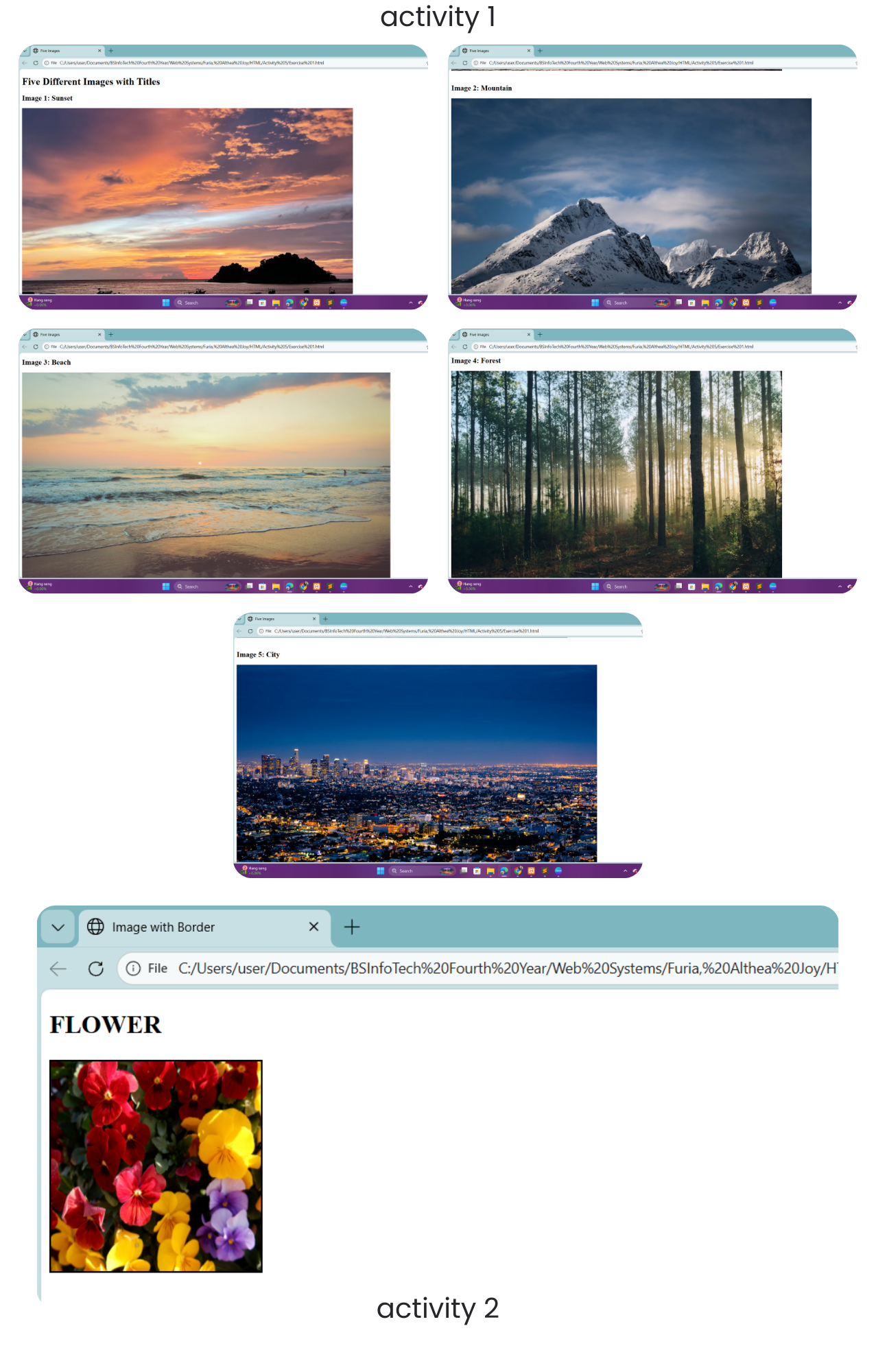 This activity required placing images on a webpage using the <img> tag.