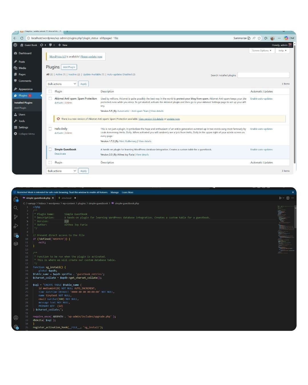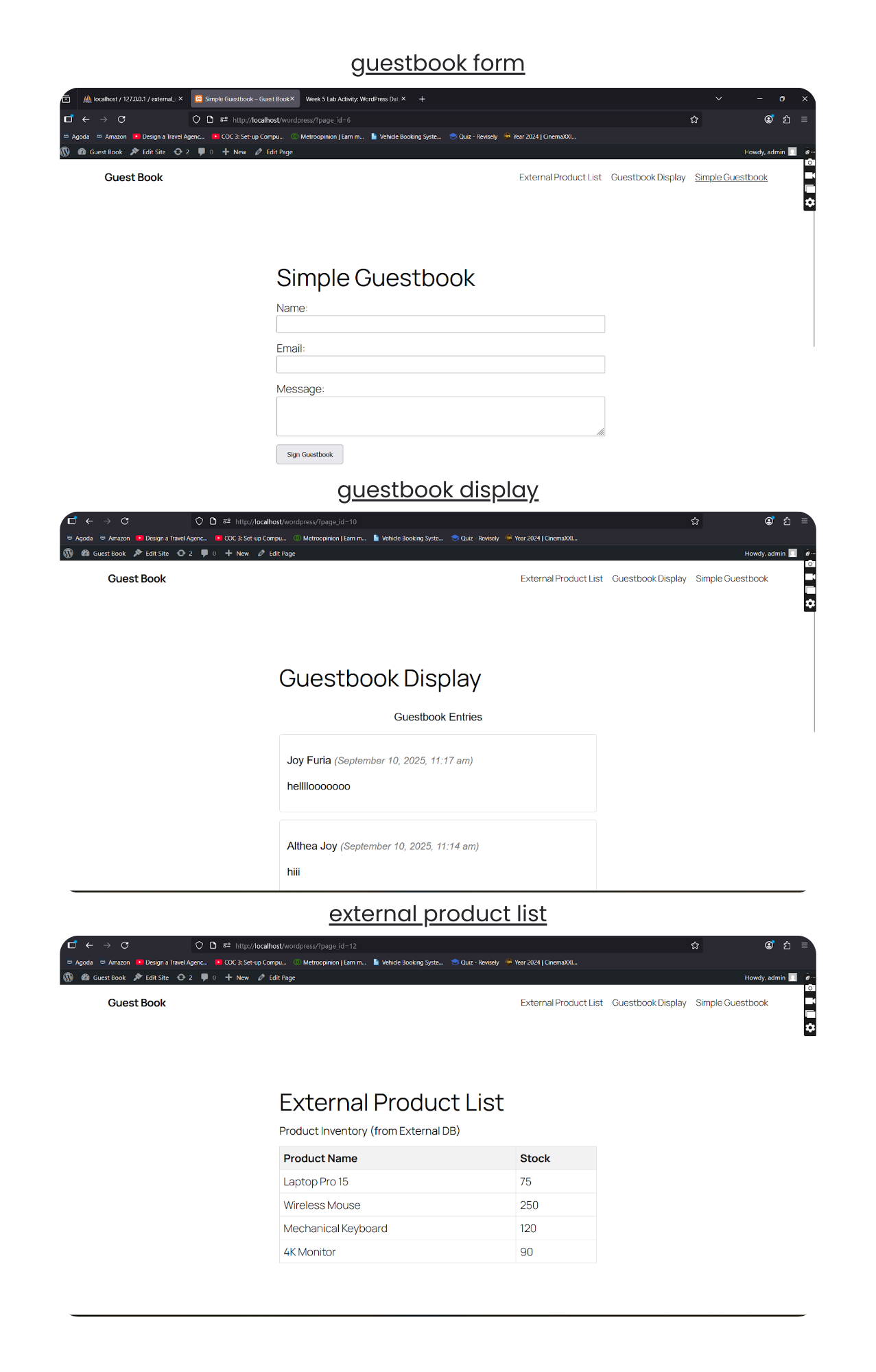This activity involved installing and configuring a simple guestbook plugin that allows users to submit comments.