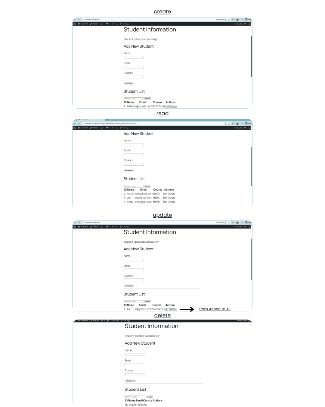 This activity required building a WordPress plugin with CRUD functionality (Create, Read, Update, Delete).