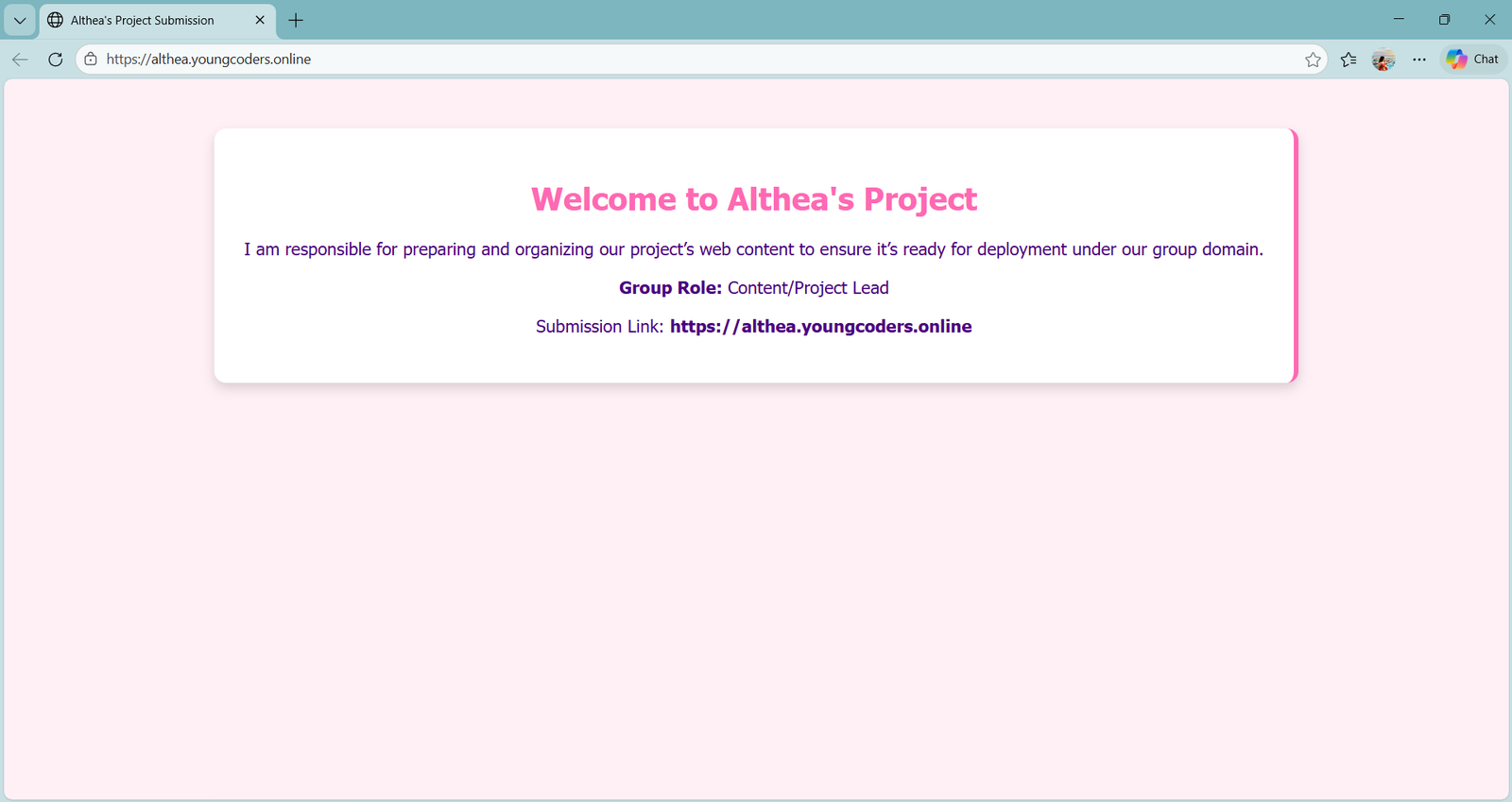 It also shows my live welcome page, confirming that the deployment was successful and accessible publicly. After connecting the domain, I tested the page to ensure it loaded correctly and that my role, description, and submission link displayed properly.